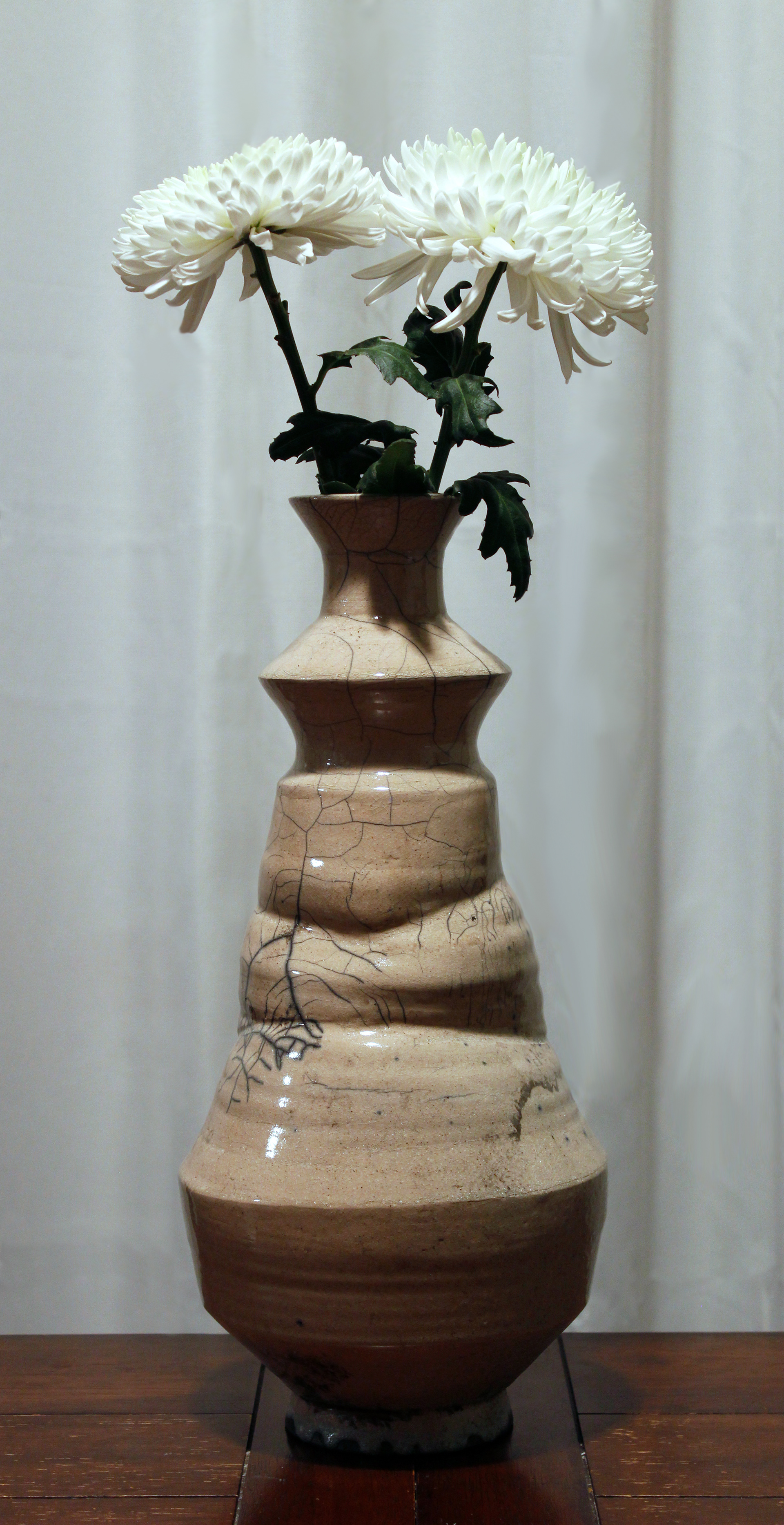 This vase is an investigation into what makes objects beautiful. Oftentimes, beauty is thought of as being pure and perfect. I wanted to push against this idea and create an object of imperfect beauty–an object that may have once approached the idea of perfection, but was molded into something imperfect and unpredictable by my hands and by the kiln. It is an object that almost appears to be damaged yet stands tall and demands attention and awe, not despite its damage and imperfection but because of it.